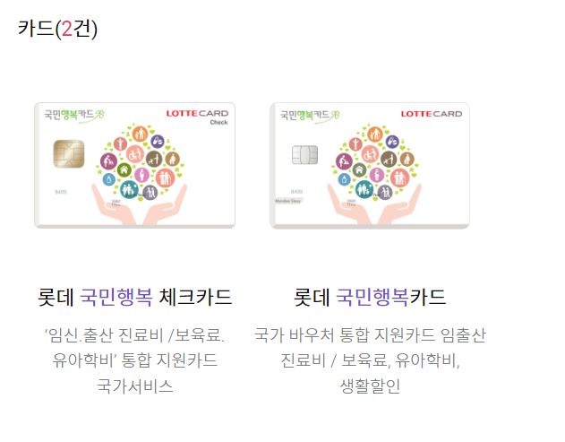 1장의 카드로 정부에서 지원하는 바우처 형태의 지원금을 이용할 수 있는 제도로 각 카드사를 통해 발급 받을 수 있습니다. 임신과 출산 가정은 대표적으로 산부인과 진료나 출산시 의료비, 기저귀나 분유 구매, 출산하면 지원받는 첫만남이용권, 어린이집 보육료 등을 국민행복카드로 결제할 수 있게 됩니다. 카드사별로 조금씩 혜택이 다르기도 한데 본인에게 맞는 카드사를 선택하면 됩니다.