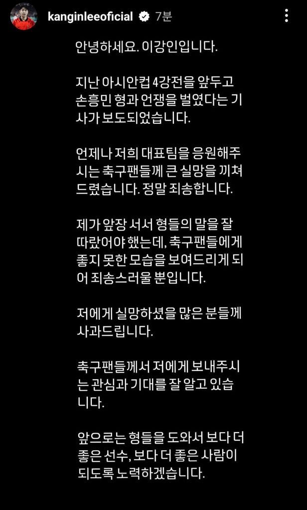 14일 사건이 보도되자 이강인은 “축구 팬들에게 실망을 끼쳐 뜨려 죄송하다”라고 말했지만 자신과 충돌한 손흥민과 대표팀 선수단에 대한 사과는 하지 않는다는 여론의 비판도 뒤를 잇고 있습니다.