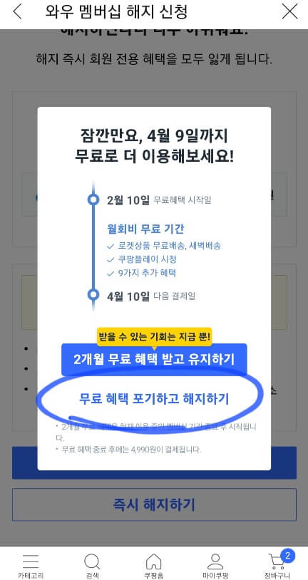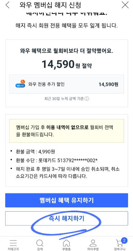 이런 좋은 혜택들에도 불구하고 와우 멤버십을 해지하고자 한다면 귀찮더라도 온갖 현혹을 물리치고 마지막까지 완료를 해야 비로소 해지가 됩니다. 물론 해지는 하자마자 그 즉시 환불이 됩니다. 카드 취소도 바로 오더라고요.