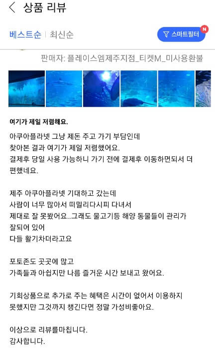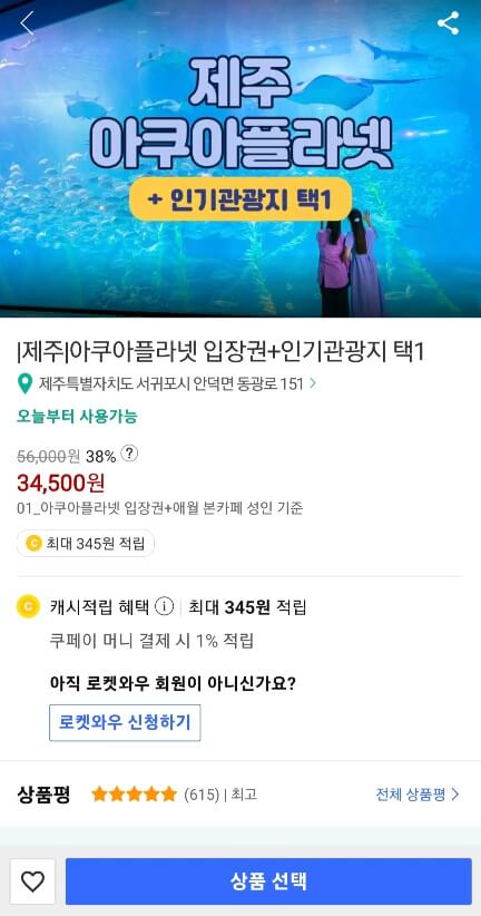 와우전용 할인이나 여행특가 상품은 이런 것들이 있습니다. 전용 할인코너가 있어서 카테고리별로 확인할 수 있습니다. 또 물건 구매뿐 아니라 티켓도 저렴하게 구입할 수 있는데요. 여행 쪽 카테고리로 가보시면 다양한 상품이 있습니다. 예를 들어 제주도의 아쿠아플라넷은 쿠팡 와우가 가장 저렴한 편에 속한다고 하는데요. 리뷰에서도 그 내용이 증명이 되고 있네요.
