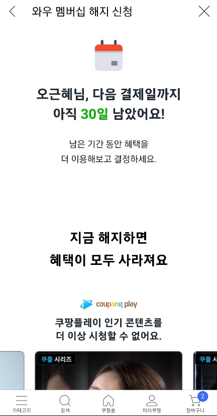 꼼수이긴 하지만 일단 쿠팡 와우 멤버십으로 가입부터 하고, 쿠팡에서 구매를 하지 않더라도 쿠팡플레이로 콘텐츠 시청만 하고 바로 해지를 하더라도 해지가 되기 때문에 크게 손해볼 것은 없는 아주 좋은 혜택입니다.