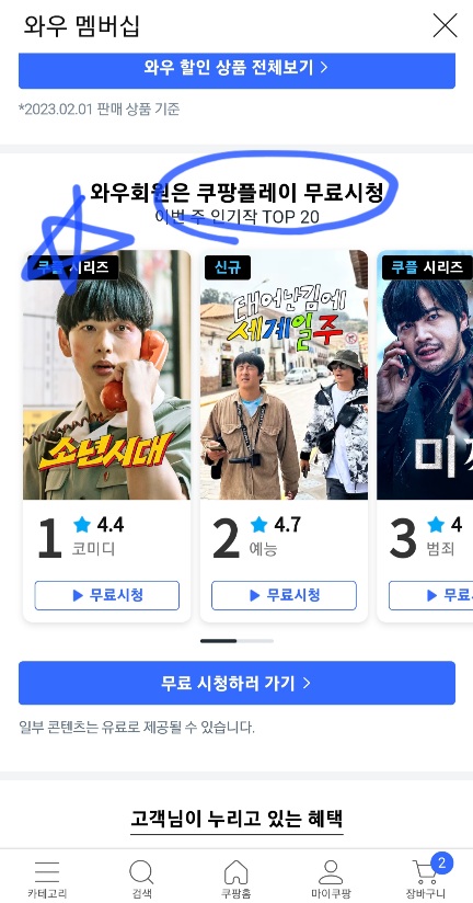 쿠팡 와우 멤버십 쿠팡플레이 무료시청