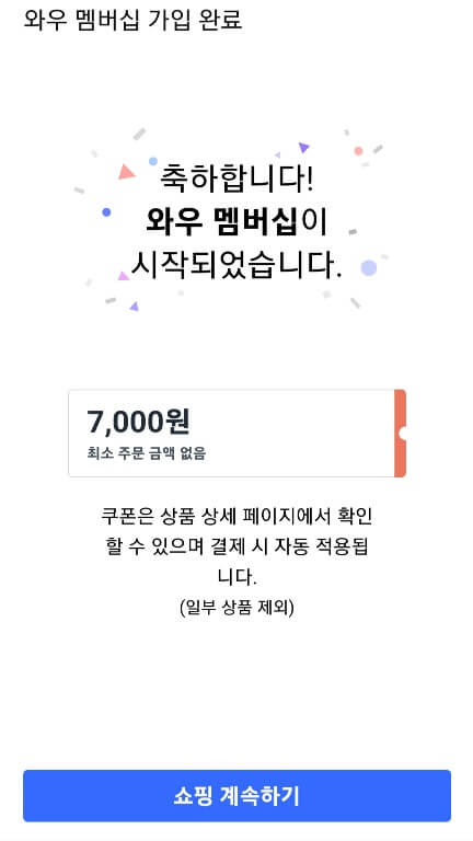 기존에 회원이었다가 해지했었다면 다시 가입을 할 경우 웰컴쿠폰이 무려 7000원이나 나옵니다. 한동안 네이버플러스를 사용해 보려고 와우를 해지했었는데 다시 가입하면서 웰컴 쿠폰을 받아 저는 아이 옷을 2벌을 더 구매했는데요. 기존 가입 이력이 있기 때문에 불편하게 처음부터 결제 정보 등을 입력할 필요 없이 바로 자동으로 연동이 됩니다.