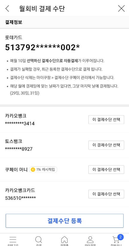 - 결제수단 등록 또는 이 결제수단 선택 등으로 변경