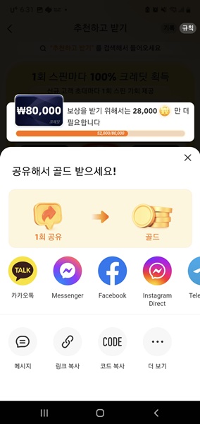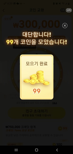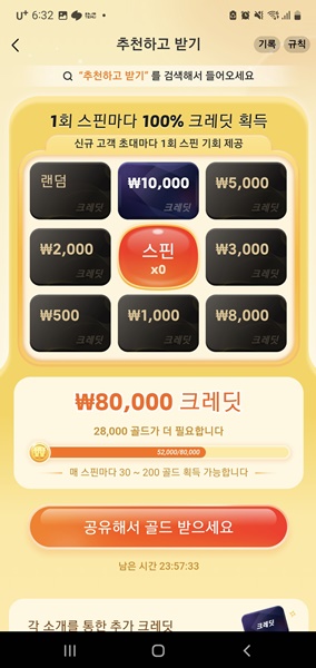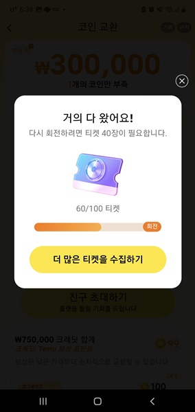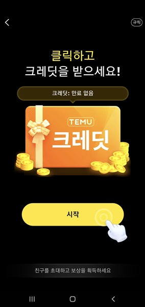 중간 베너에 크레딧 및 무료 선물 받기에서 "추천하고 받기" 항목이 보일 겁니다. 테무는 친구를 초대하면 코인을 모을 수 있고 그걸 통해 룰렛을 돌리면 현금처럼 바로 사용할 수 있는 최소 5만 크래딧을 지급합니다. 친구가 가입하면 확률에 따라 티켓이 모아집니다.